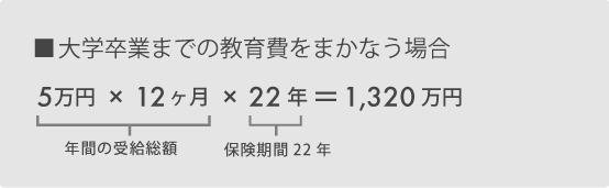もし、収入保障保険に加入して1,283万円の教育費を賄うことを考え、毎月5万円を受け取れる商品に22年間加入したとしましょう。加入当時には1,320万円の保障があります。